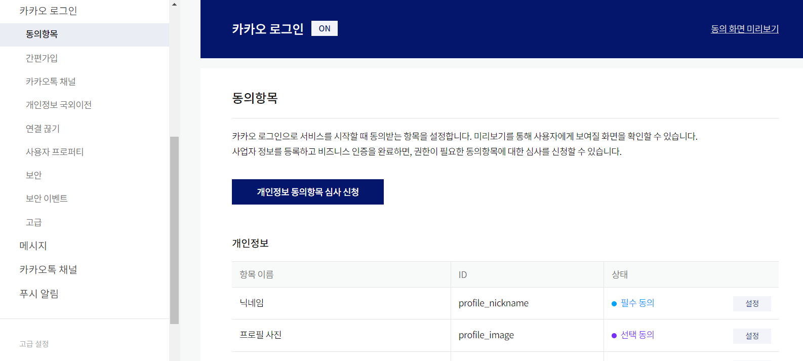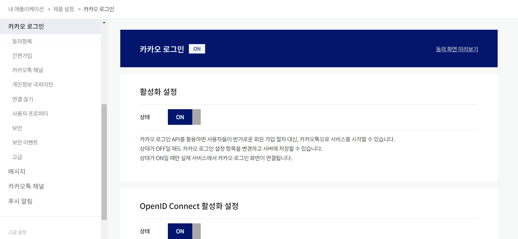 위에서 등록한 애플리케이션에 이어서 카카오 로그인 설정을 진행한다. 로그인 설정에서 지정한 Redirect URI를 통해 인가 코드를 받으며, 해당 인가 코드로 요청을 보내면 토큰을 받을 수 있다.