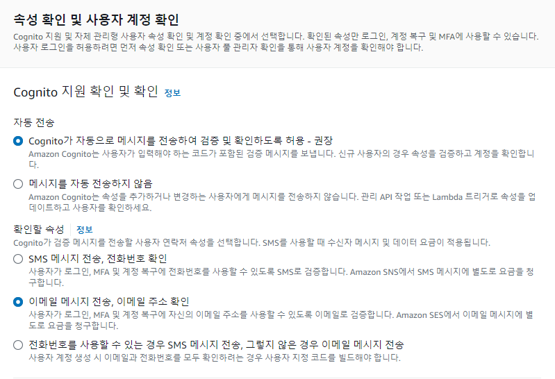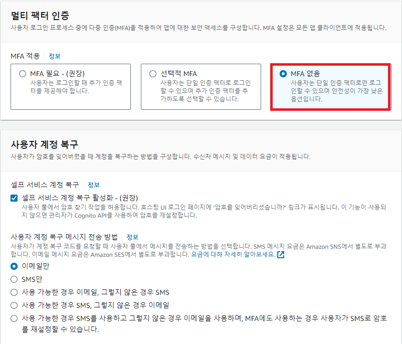 MFA 방법으로 SMS메시지 혹은 인증 앱을 이용하는 방법이 있는데, SMS 메시지 방식은 Amazon SMS에서 비용이 별도 부과되어 사용하지 않기로 결정했다.