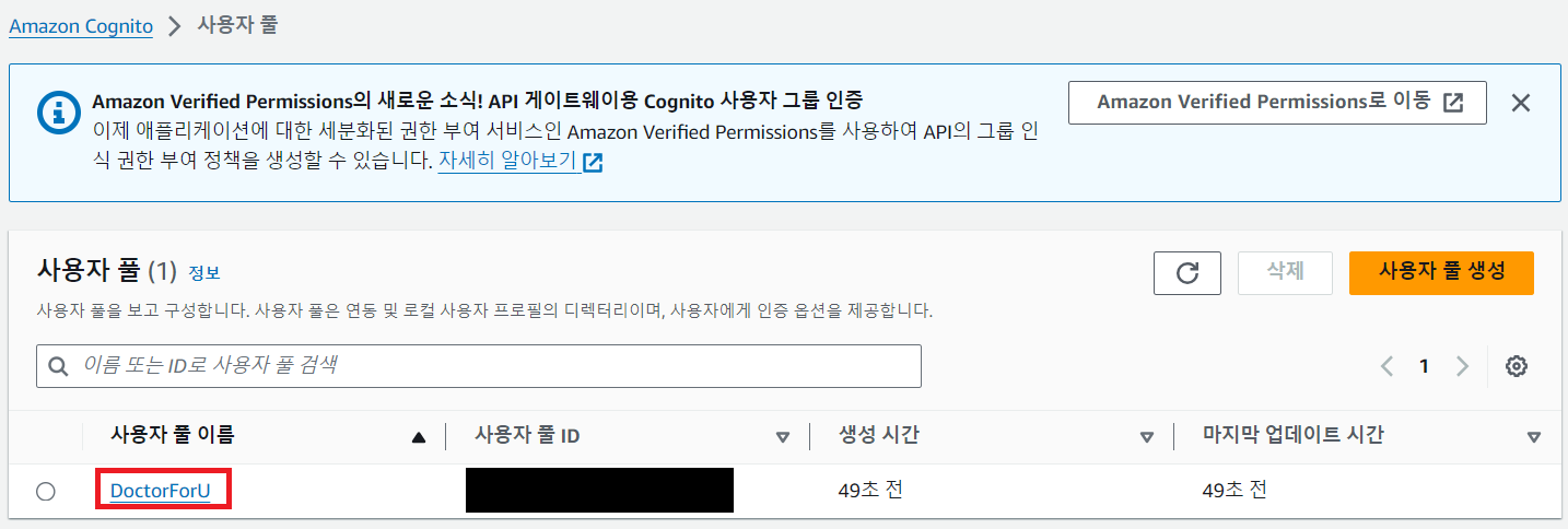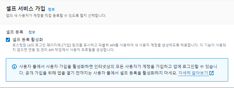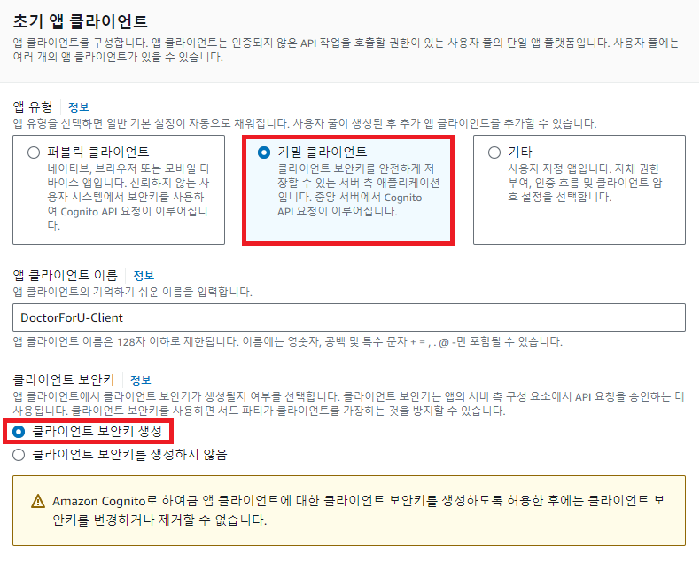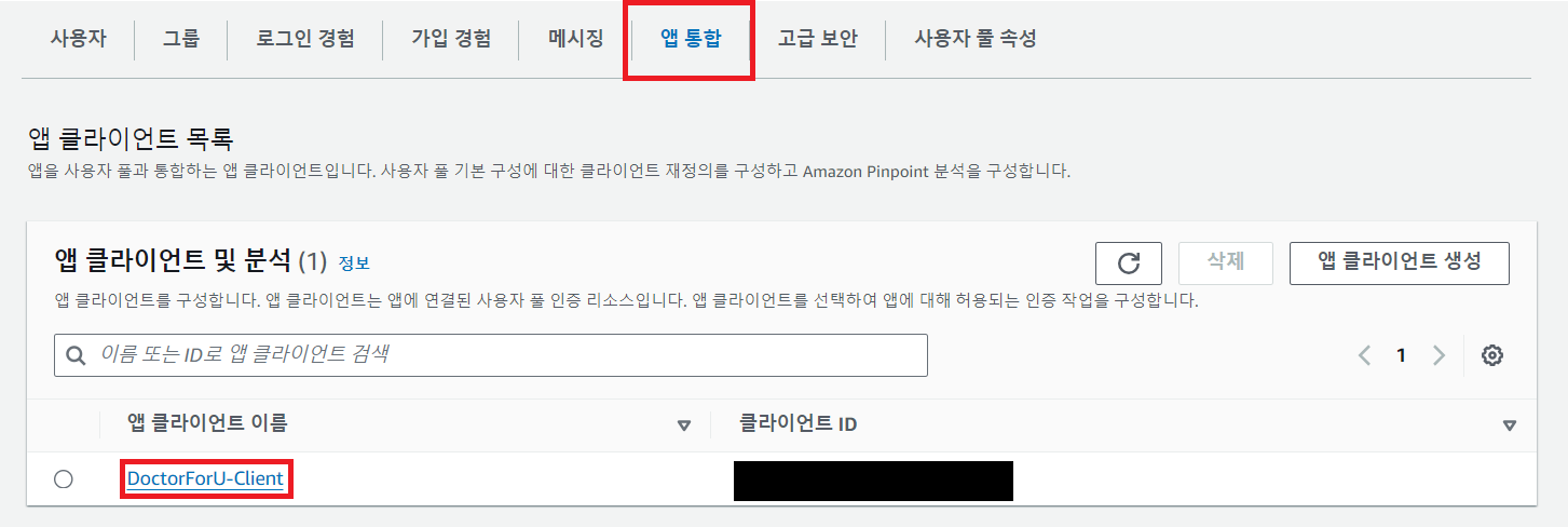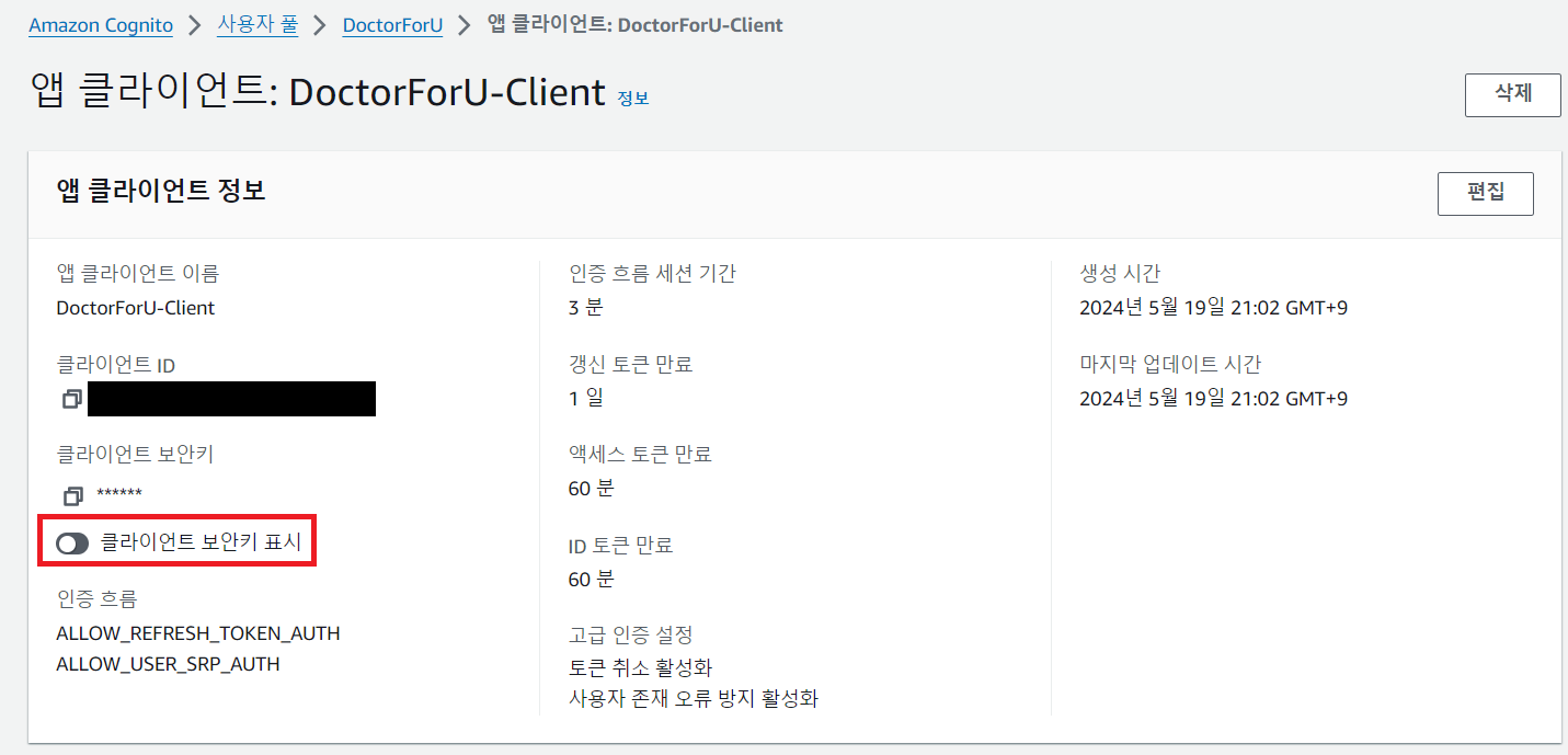 클라이언트 보안키 표시를 활성화한 후, 클라이언트 ID와 보안키를 확인한다. 이 두 값들을 가지고 있어야 cognito의 사용자풀에 접근이 가능하다. 따라서 ID와 보안키가 공개되지 않도록 주의해야 한다.