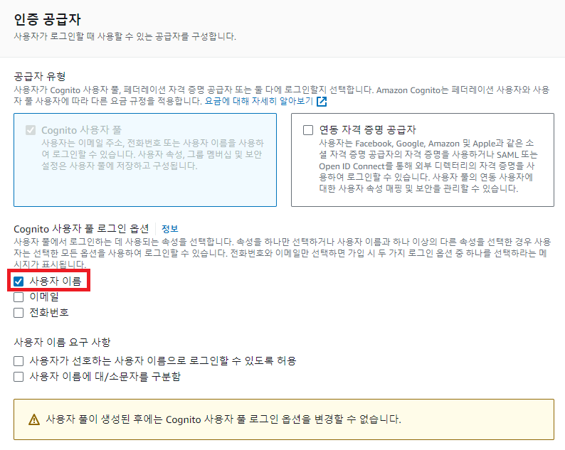 유저 아이디로 로그인을 구현할 것이기 때문에 사용자 이름을 선택해 주었다.