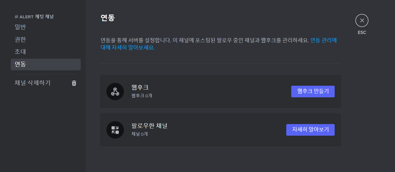 다음은 디스코드 웹훅 연동 과정이다. 먼저 디스코드에 알림용 채널을 생성한 후, 채널 설정 페이지에 들어가면 다음과 같은 연동 설정을 볼 수 있다.