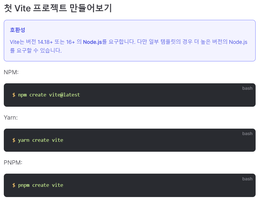 - Vite를 시작하기에 앞서 Vite는 Node.js가 설치되어 있어야 한다.