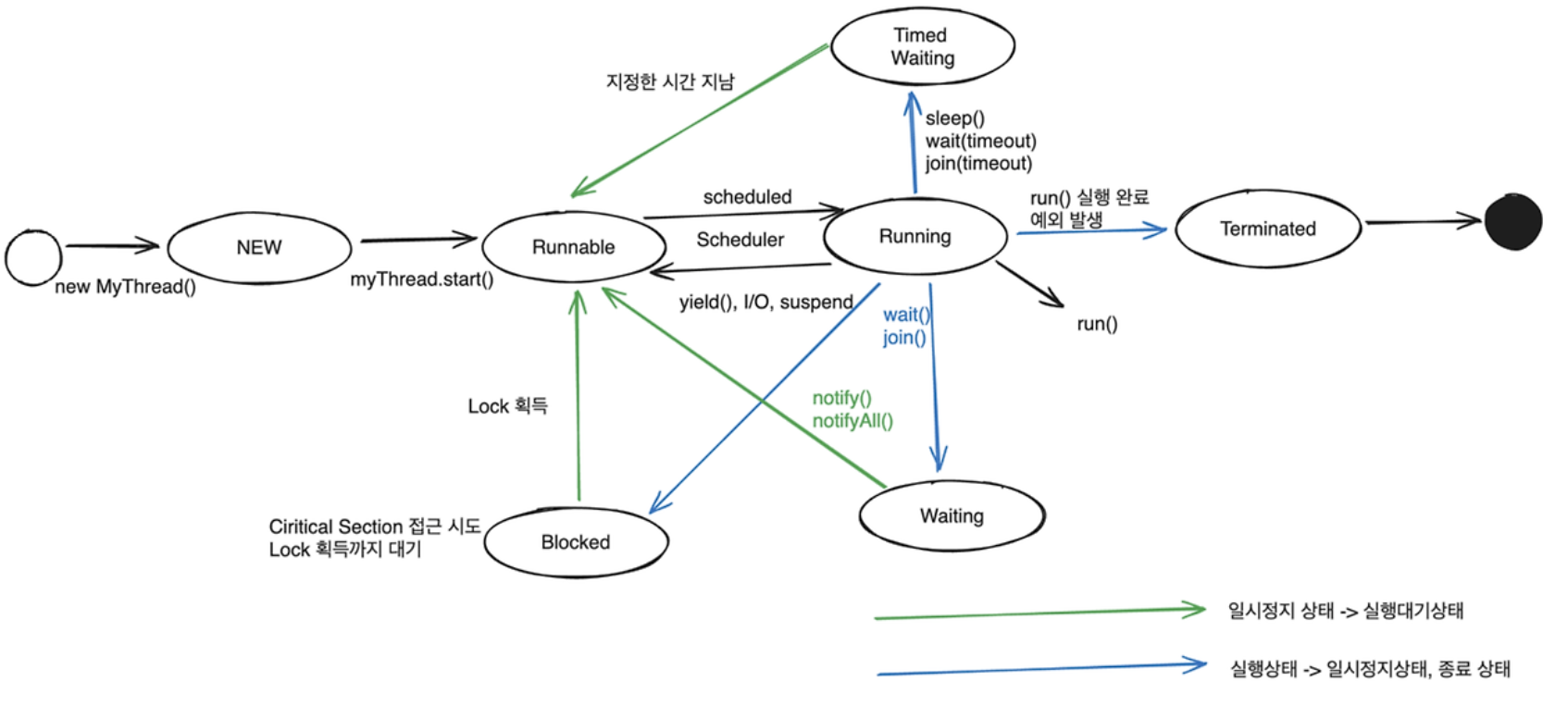 - New (새로운 상태): 스레드가 생성되었으나 아직 시작되지 않은 상태.