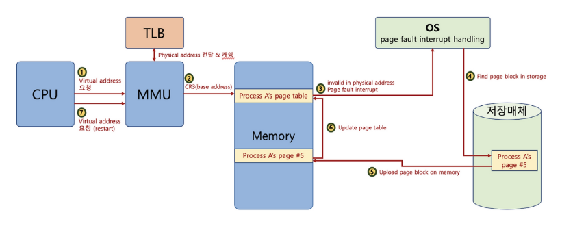 - 페이지 테이블을 참조할 때, 원하는 페이지가 없는 경우 kernel에서 page fault interrupt가 발생하고 디스크에 원하는 페이지를 ram에 load한다.