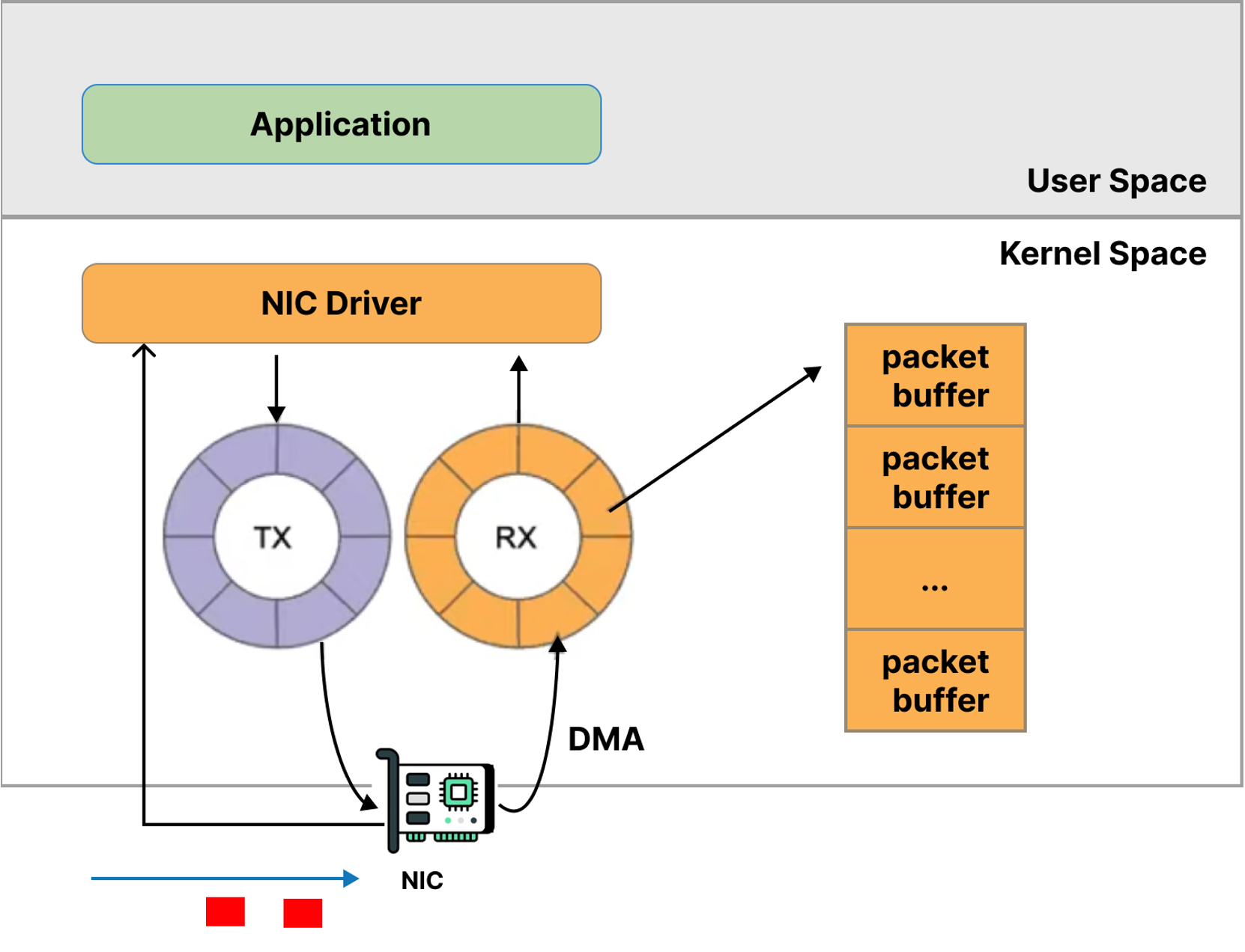 - NIC는 TX Ring을 확인한 뒤, DMA를 통해 해당 메모리 버퍼의 패킷 데이터를 읽어온다.