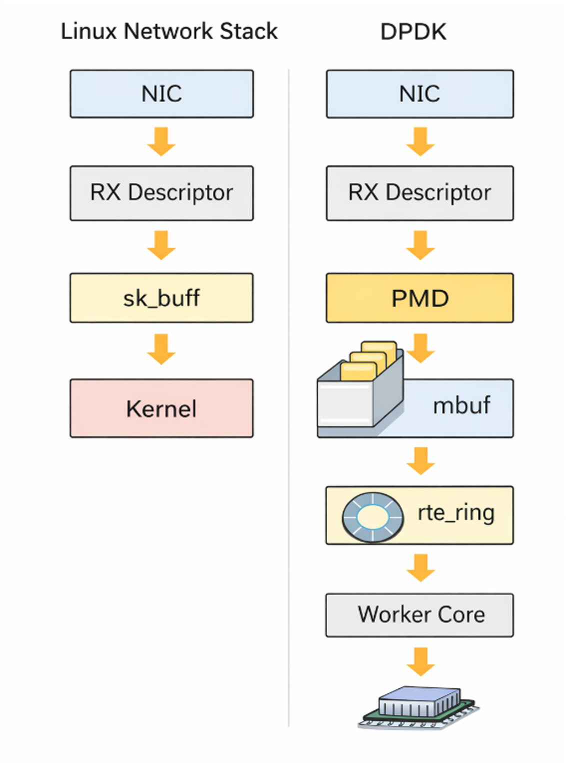 DPDK는 Data Plane Development Kit의 약자로, Intel 아키텍처 기반에서 고성능 패킷 처리를 위해 설계된 시스템 소프트웨어이다. 일반적인 리눅스 환경에서는 ice와 같은 커널 NIC 드라이버가 NIC를 제어하고, 패킷은 커널 네트워크 스택을 거쳐 처리된다.