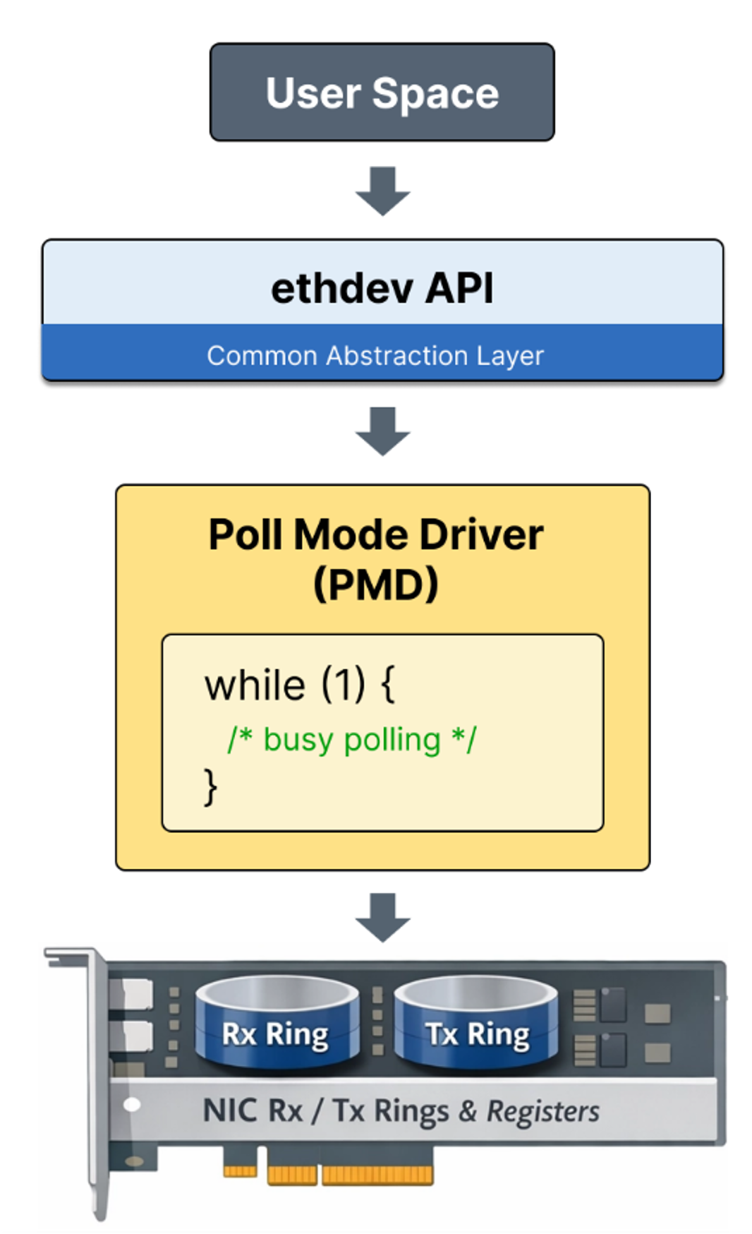 애플리케이션은 rte_eth_dev 라는 포트 객체를 기준으로 rte_eth_rx_burst(), rte_eth_tx_burst() 와 같은 ethdev API를 호출한다. 그러면 실제로는 rte_eth_dev 에 연결된 PMD 함수가 실행되어, 해당 NIC 하드웨어를 직접 제어하게 된다.