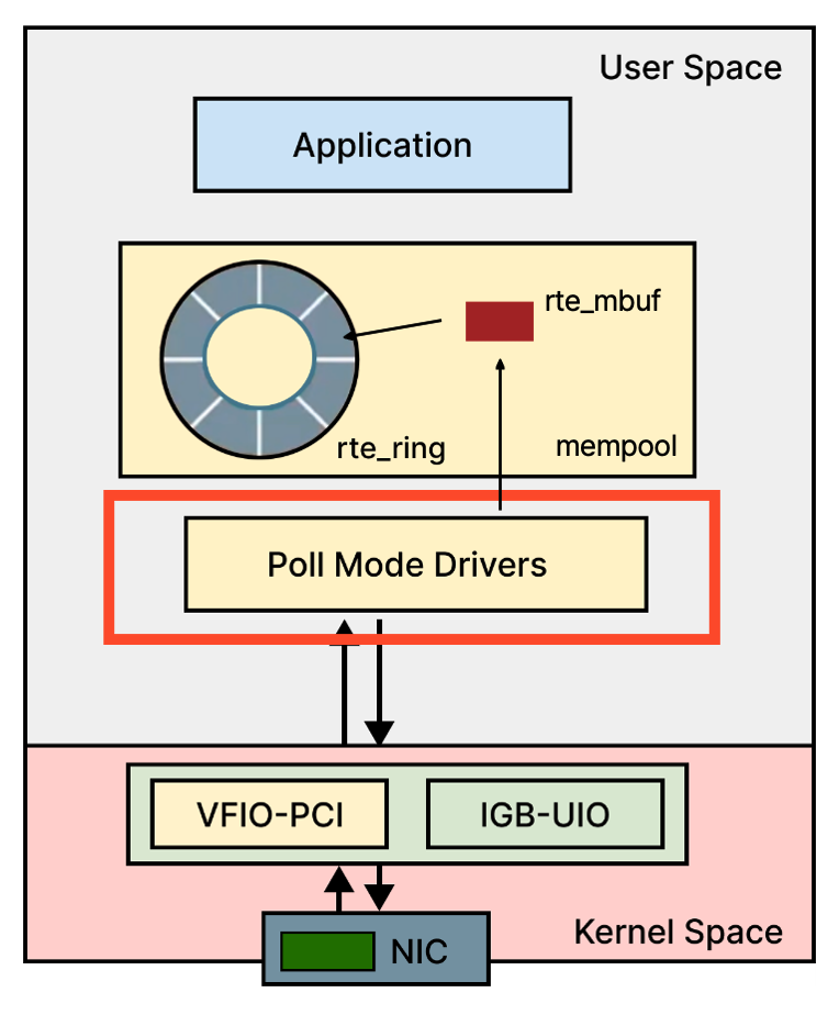 앞서 설명한 VFIO, UIO 드라이버는 패킷을 직접 처리하는 드라이버가 아니다. 이들의 역할은 DPDK 애플리케이션이 User Space에서 NIC 하드웨어에 접근할 수 있도록 연결해 주는 것에 가깝다.