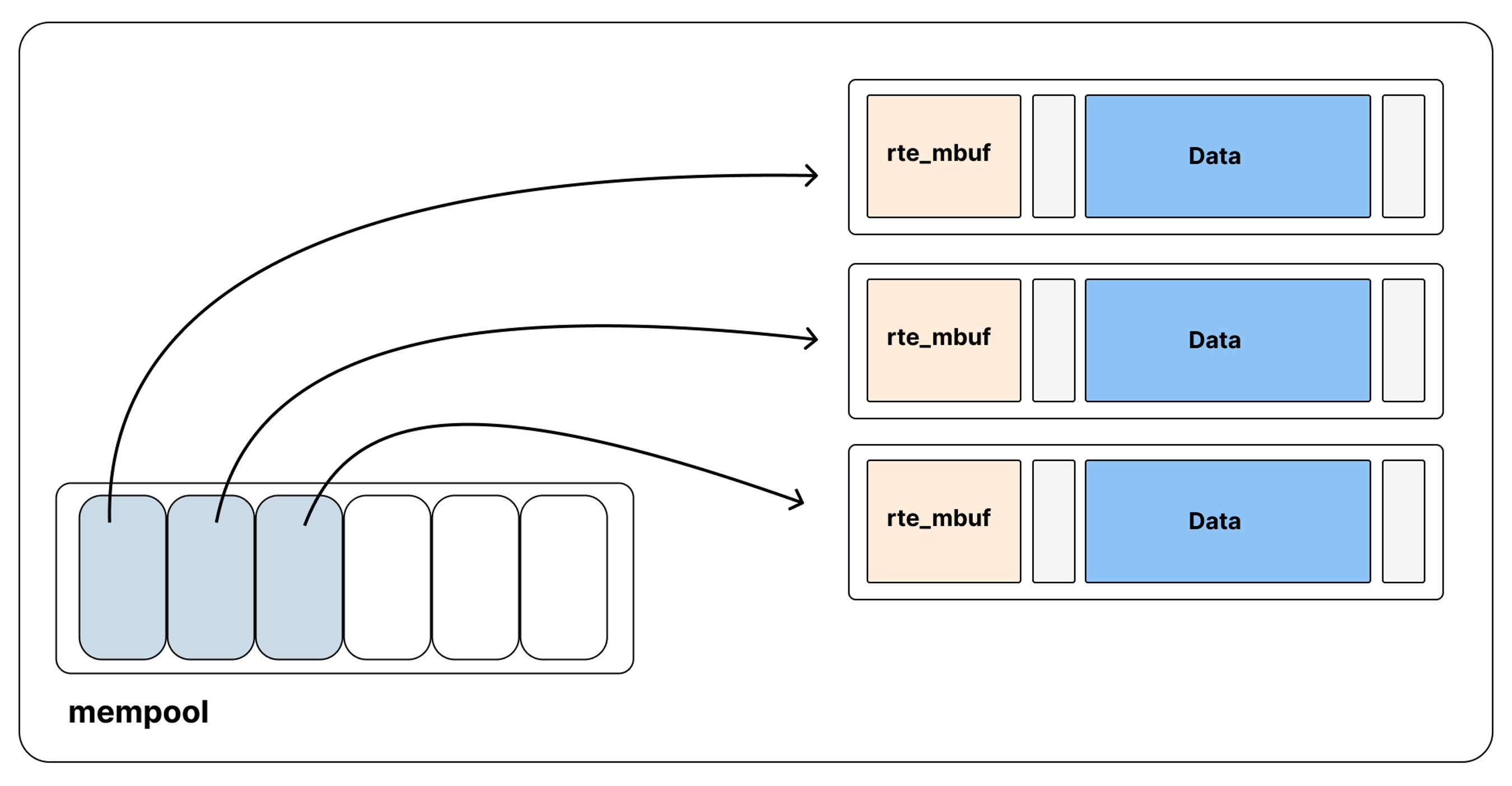 일반적인 방식처럼 매번 alloc() / free() 를 호출하는 대신, 미리 준비된 mempool 에서 mbuf 를 꺼내 사용한 뒤 다시 반납한다. 이를 통해 반복적인 메모리 할당과 해제로 인한 비용을 줄일 수 있다.