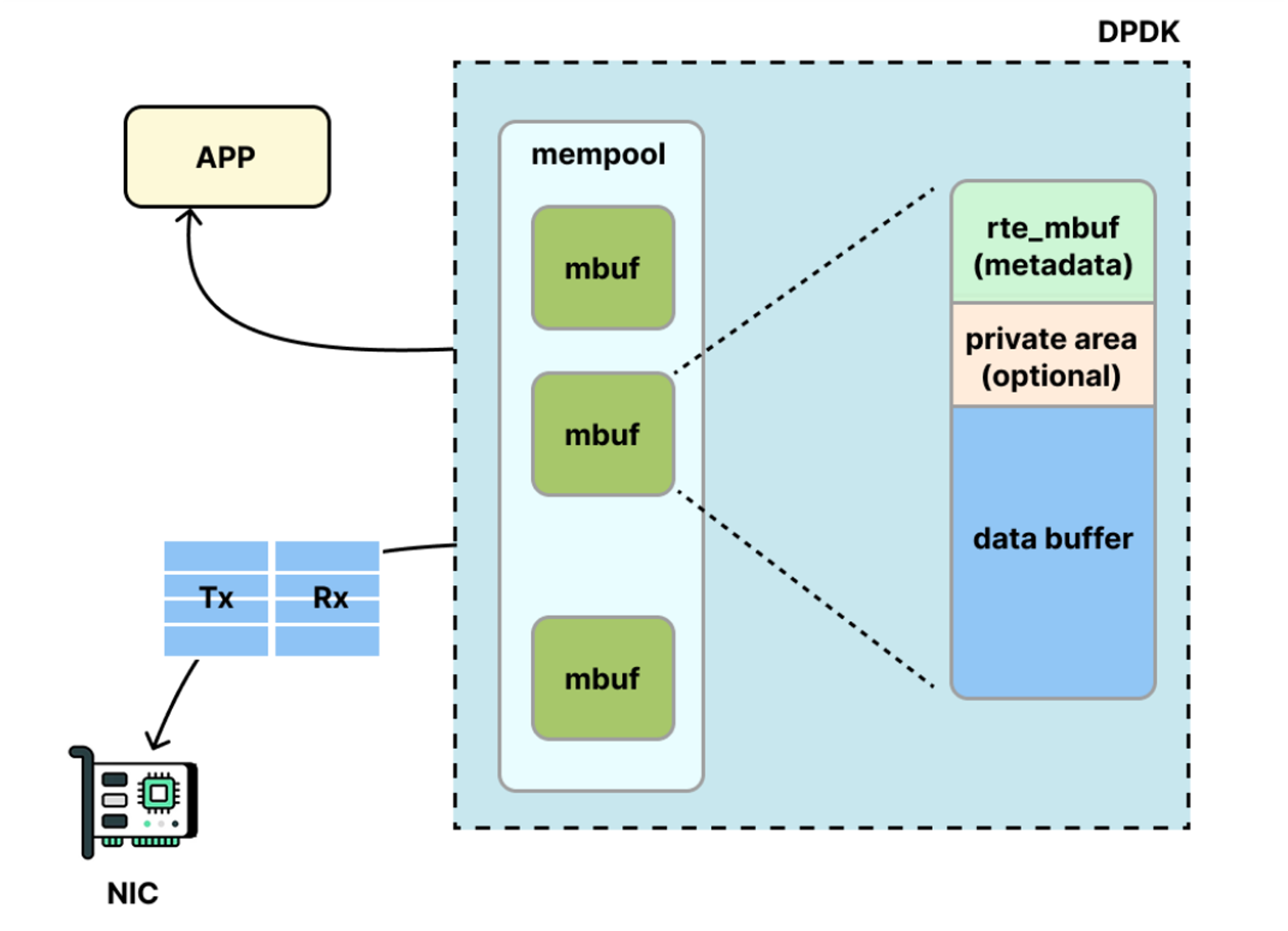 예를 들어 rte_eth_rx_burst() 는 NIC로부터 패킷을 받아올 때, 패킷 데이터를 새로 복사해서 반환하는 것이 아니라 수신된 패킷이 담긴 mbuf 포인터 배열을 채워 반환한다. 이 덕분에 불필요한 데이터 복사를 줄이고 고속 처리가 가능하다.