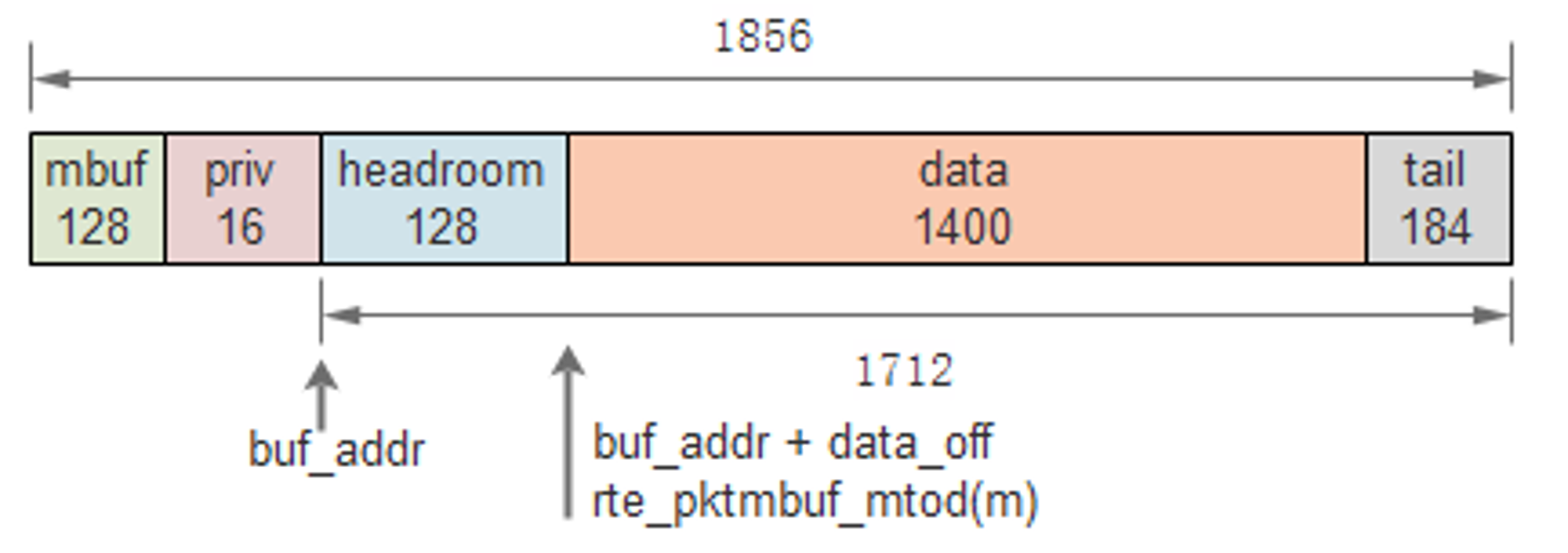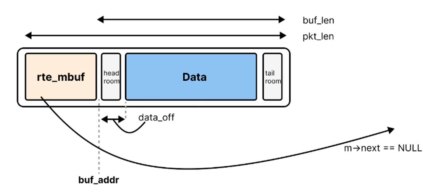 그래서 DPDK는 headroom과 tailroom을 두고, 필요 시 data_off 같은 오프셋만 조정하여 복사 없이 헤더를 붙일 수 있도록 설계되어 있다. 기본 headroom 크기는 RTE_PKTMBUF_HEADROOM 매크로로 정의되며, 일반적으로 128바이트이다.