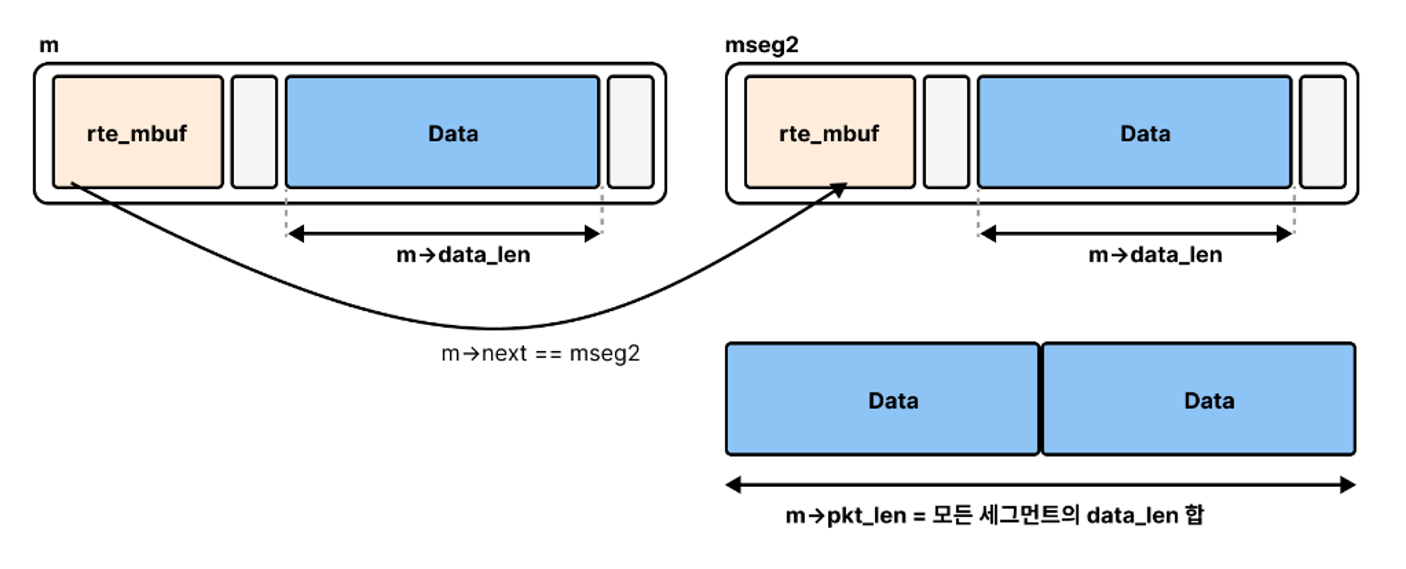 multi segment는 하나의 패킷 데이터를 여러 개의 mbuf에 나누어 저장하고, 이를 next 포인터로 연결하는 형태이다.