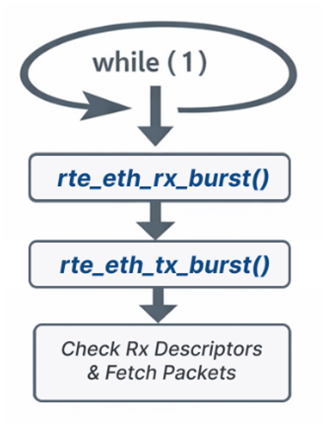수신 시에는 완료 상태로 표시된 descriptor가 있는지 계속 확인하고, 완료된 descriptor가 있으면 그에 연결된mbuf를 즉시 가져와 처리한다. 패킷이 없는 경우에도 PMD는 sleep 상태로 들어가지 않고 계속 descriptor 상태를 확인하는데, 이 방식을 Busy Polling 이라고 한다.
