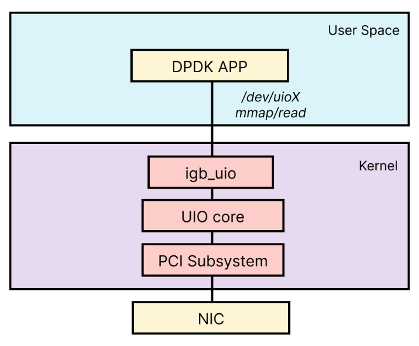 하지만 DPDK는 일반 커널 NIC 드라이버를 통해 패킷을 송수신하는 것이 아니라,NIC를 커널로부터 분리한 뒤 User Space에서 직접 제어한다. 이를 위해 DPDK는UIO또는VFIO와 같은PCI 장치 접근용 커널 드라이버를 사용한다.