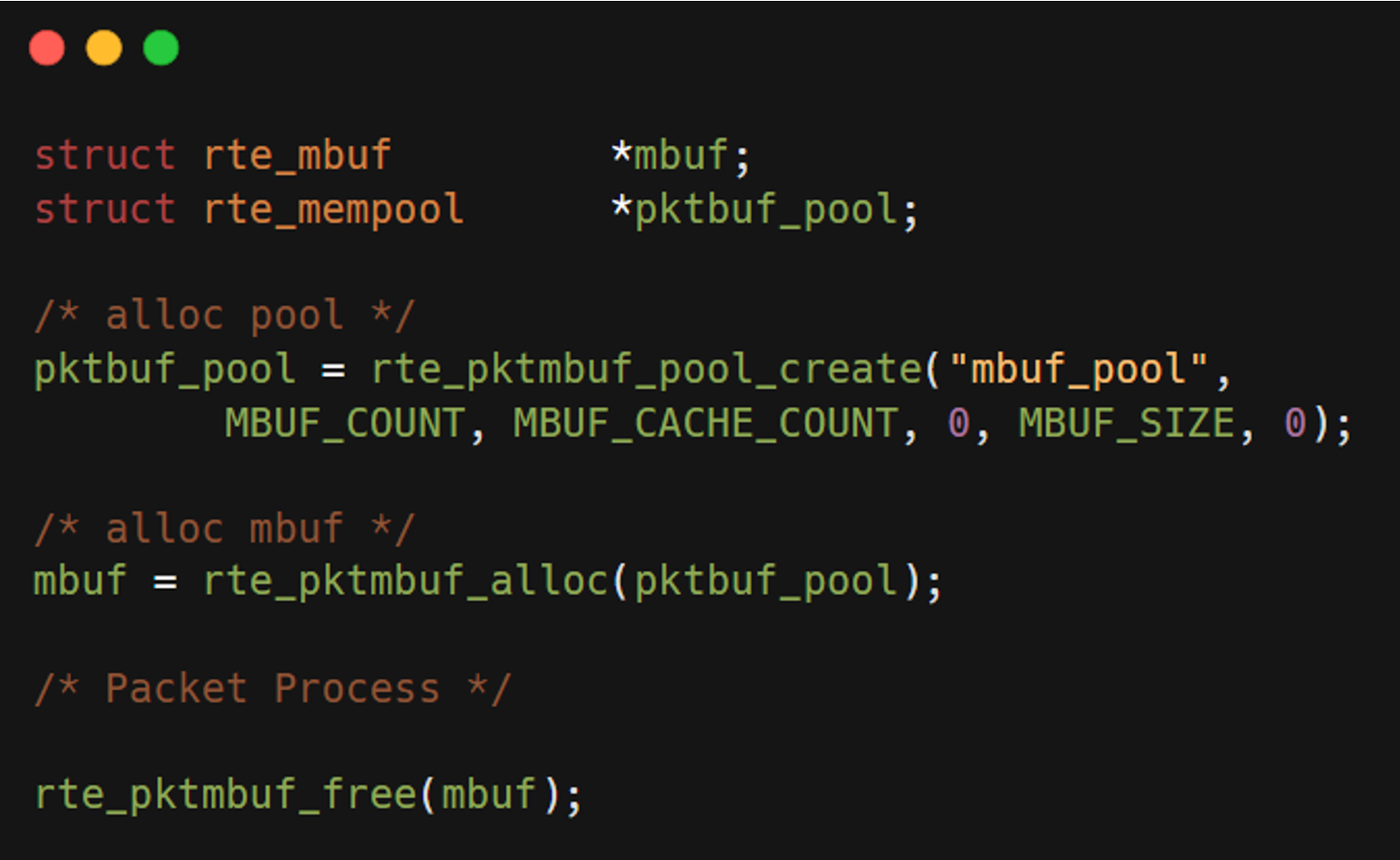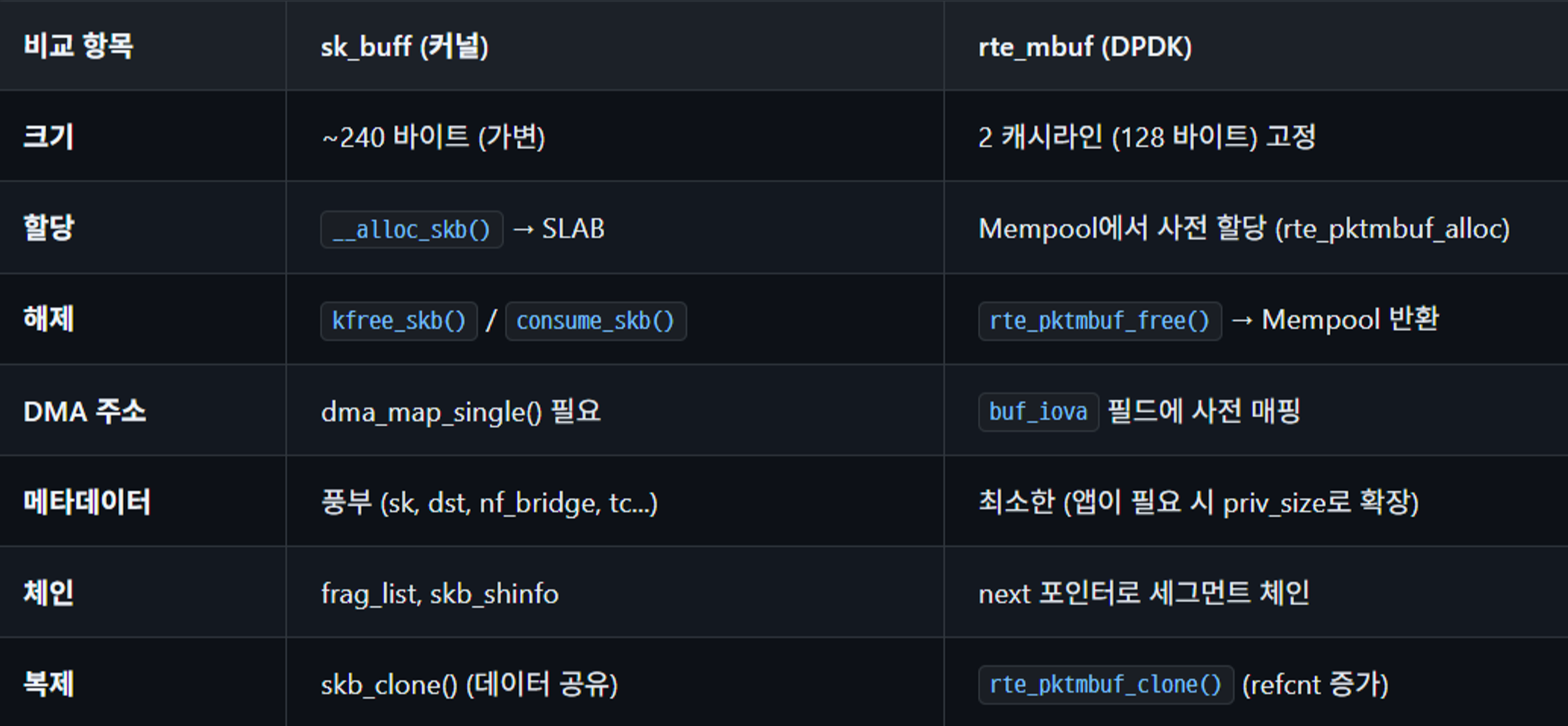 이렇게 PMD가 패킷을 가져올 때, 일반적인 리눅스 커널에서는 패킷을 sk_buff 구조체로 관리하지만, DPDK에서는 mbuf 라는 구조를 사용한다.
